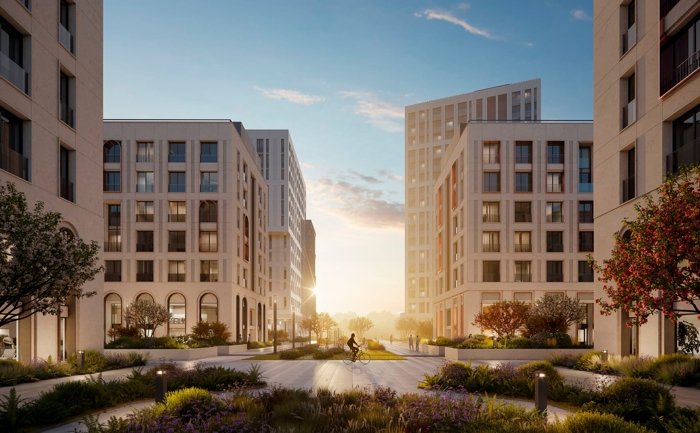 Высотные башни с панорамными видами, здания средней этажности, создающие атмосферу уюта во внутренних дворах, малоэтажные таунхаусы и разновысотные дома с лоджиями вдоль берега образуют единое гармоничное пространство.