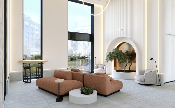 Лобби в стиле урбан-минимализма поражает своим простором и функциональностью. Здесь не только привычные колясочные, санузлы и ресепшн, но и полноценное место для отдыха, работы и творчества.