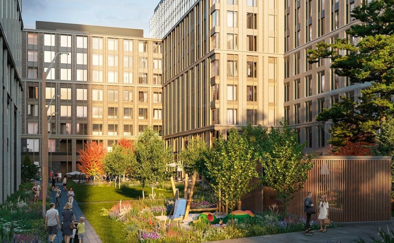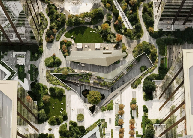 Внутренняя территория комплекса стала зелёной зоной отдыха для жителей, свободной от автомобилей. На крыше стилобата раскинулся приватный двор-сад площадью около 7700 квадратных метров. Здесь растут разнообразные деревья, кустарники, многолетние цветы и травы: берёзы и сирень, тюльпаны и крокусы, нарциссы, японская спирея и другие.